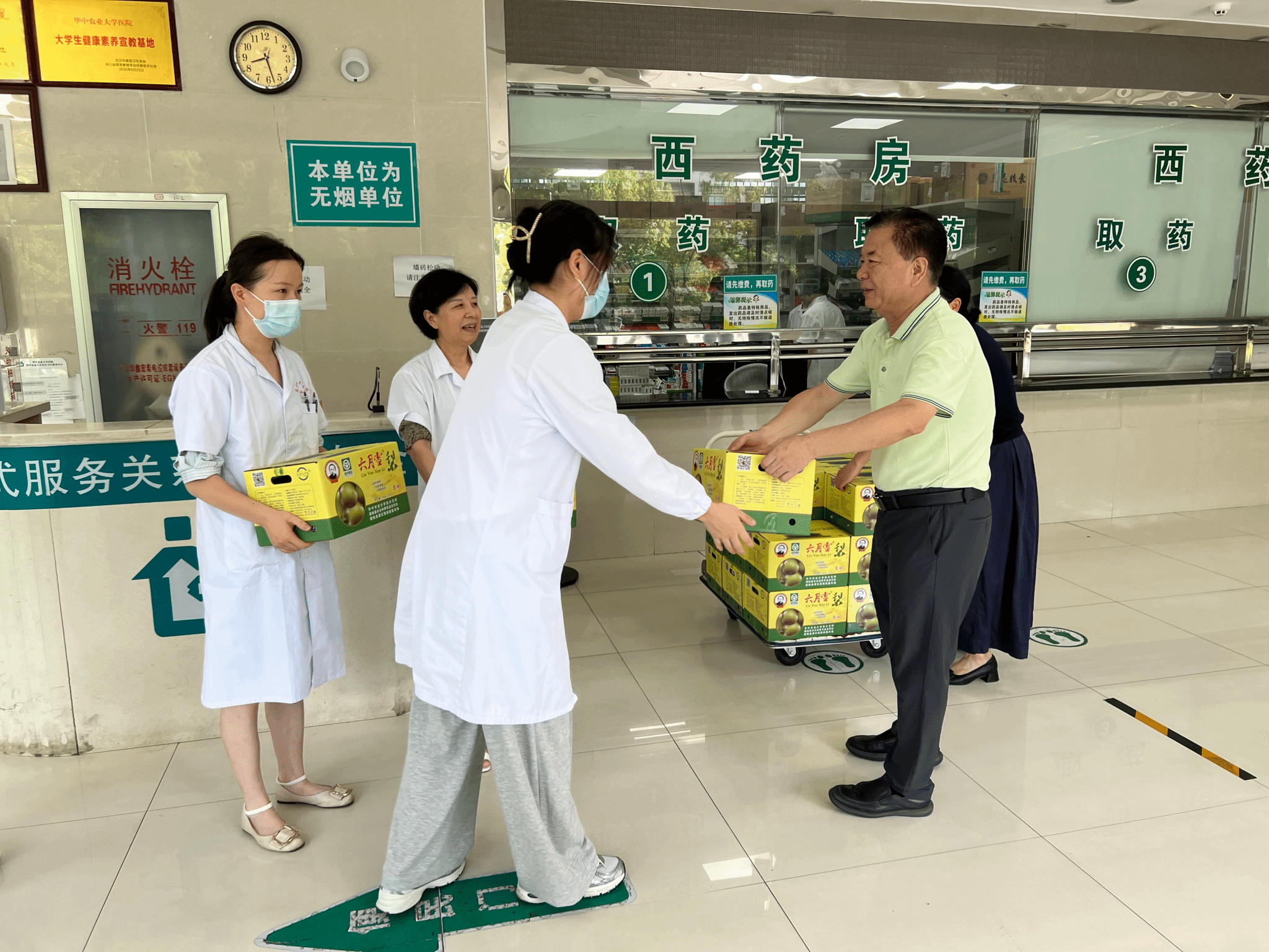 姚江林为暑期坚守一线的校医院医护人员送慰问品(记者 陈超奇 摄)