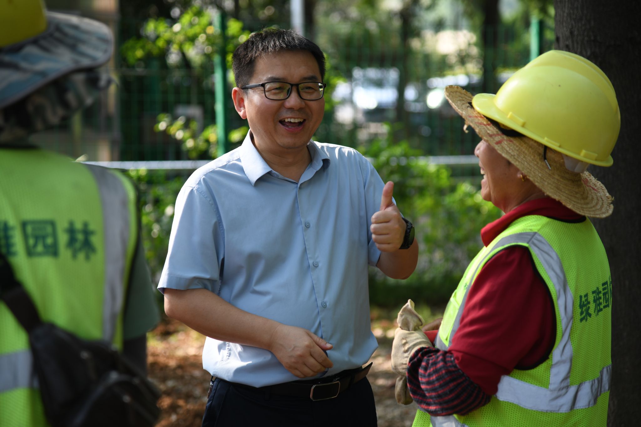 严建兵慰问酷暑下开展园林维护的工作人员(记者 刘志伟 摄)